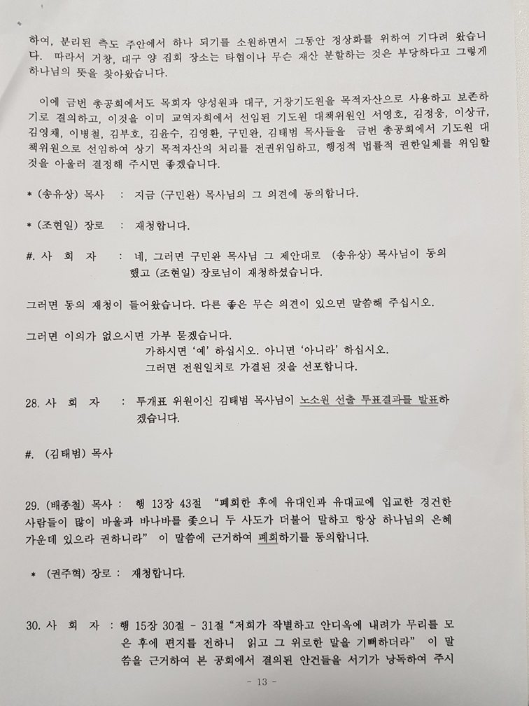 - 사회자: , 그러면 구민환 목사님 그 제안대로 송유상 목사님의 동의했고, 조현일 장로님이 재청하셨습니다.