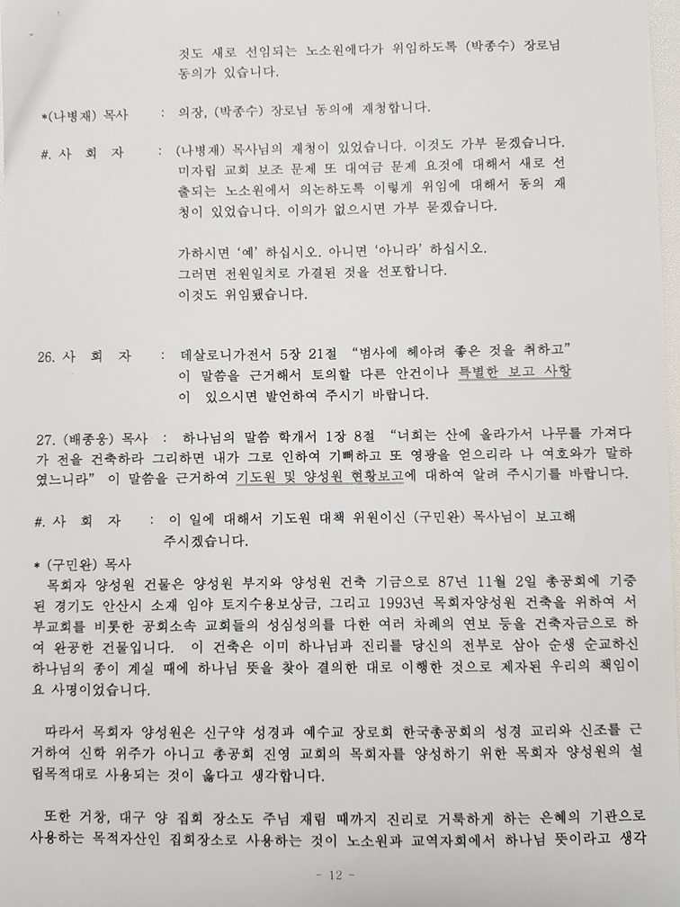 이에 금번 총공회에서도 목회자양성원과 대구, 거창 기도원을 목적자산으로 사용하고 보존하기로 결의하고, 이것을 이미 교역자회에서 선임된 기도원 대책위원인 서영호, 김정웅, 이상규, 김영채, 이병철, 김부호, 김윤수, 김영환, 구민환, 김태범 목사들을 금번 총공회에서 기도원 대책위원으로 선임하여 상기 목적자산의 처리를 전권위임하고, 행정적 법률적 권한 일체를 위임할 것을 아울러 결정해주시면 좋겠습니다.